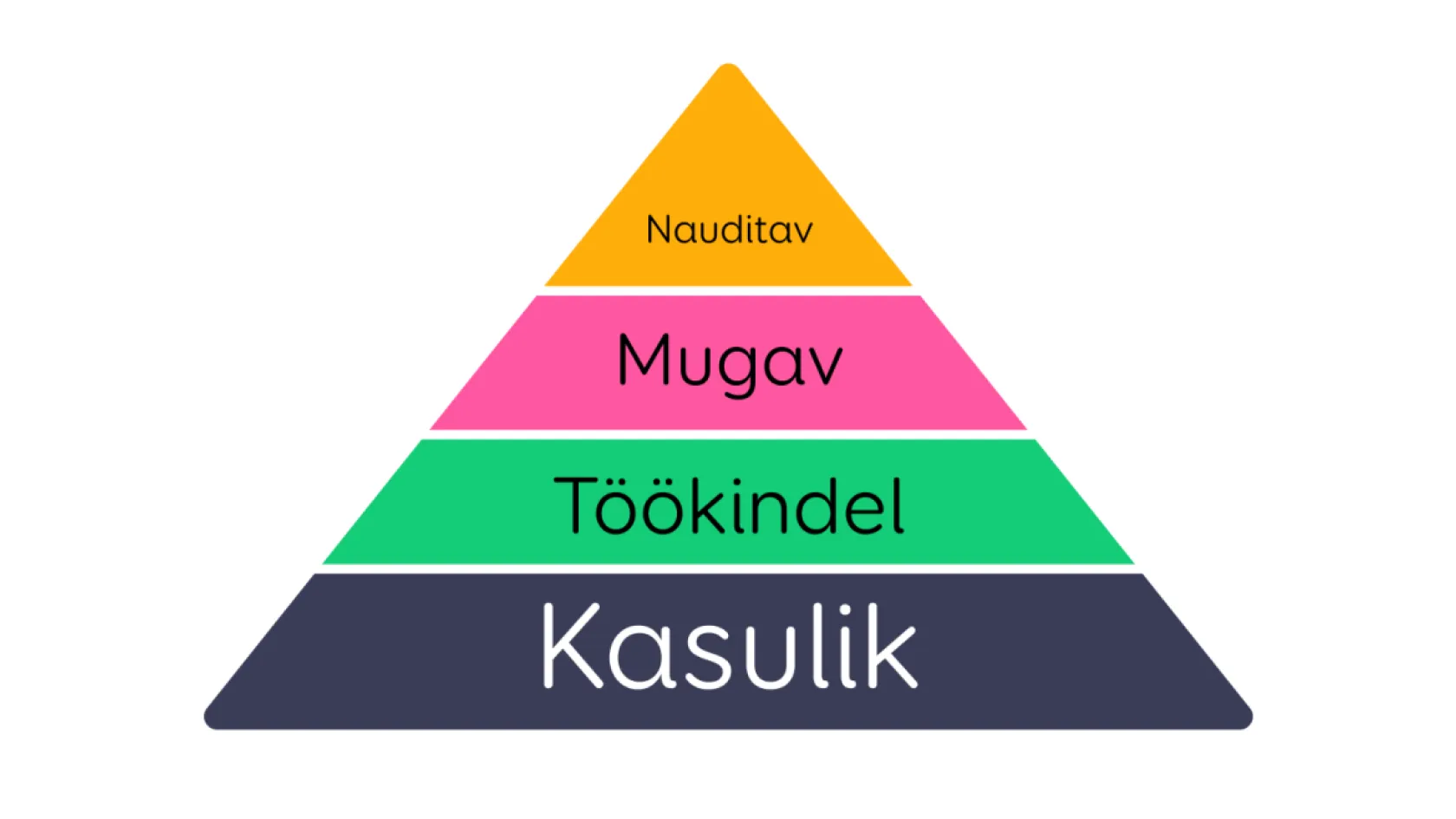 - Mugav: antud tase keskendub sellele, kui mugav ja lihtne on toodet või teenust kasutada. Kasutatav disain on intuitiivne ja lihtne, vähendades kasutaja kognitiivset koormust ning võimaldades neil saavutada oma eesmärke kiirelt ja vaevata.