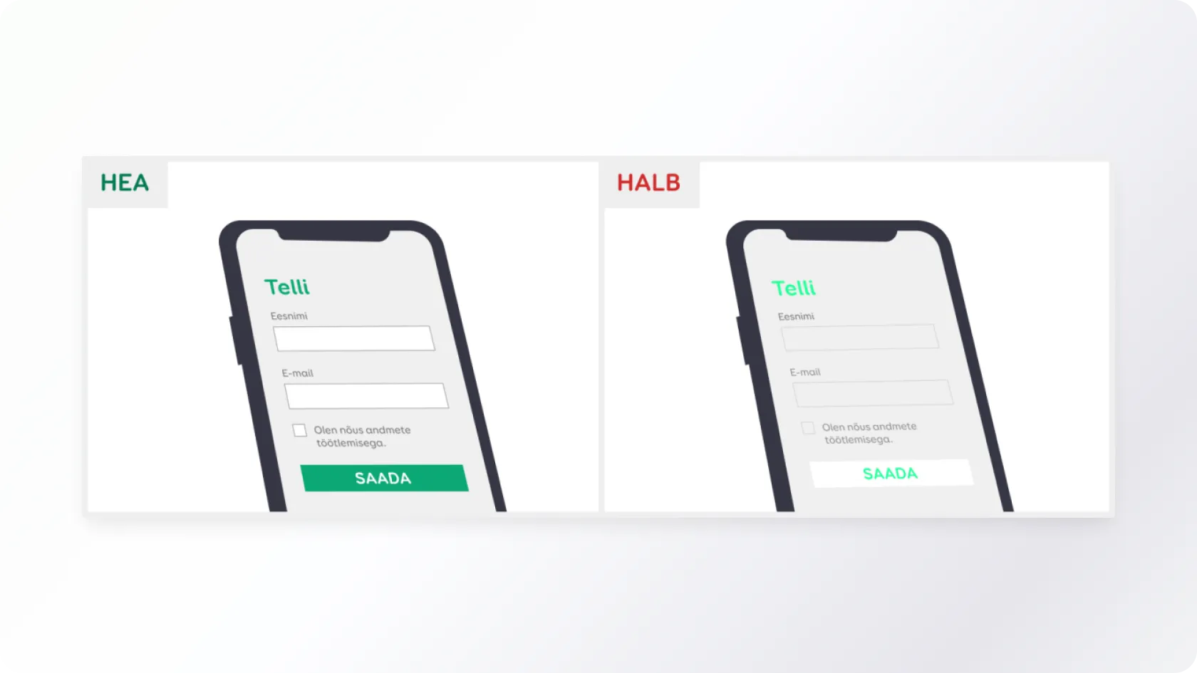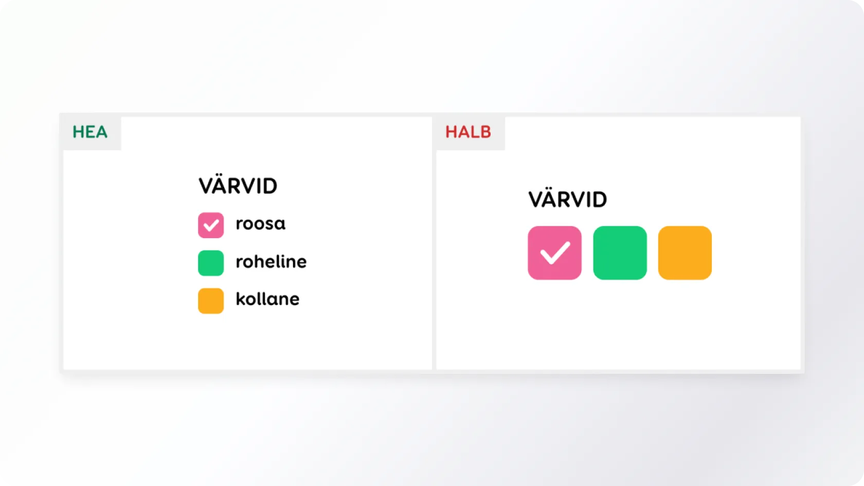 Ainult värviga ei tohi eristada ka vigaseid vormivälju – lisada tuleks ikoon või hoopis paksem piirjoon. Veel ühe näitena võib tuua toote värvi valiku e-poes. Ka siinkohal ei piisa ainult värvilistest kastikestest, vaid värv tuleks kirjutada ka tekstina välja.