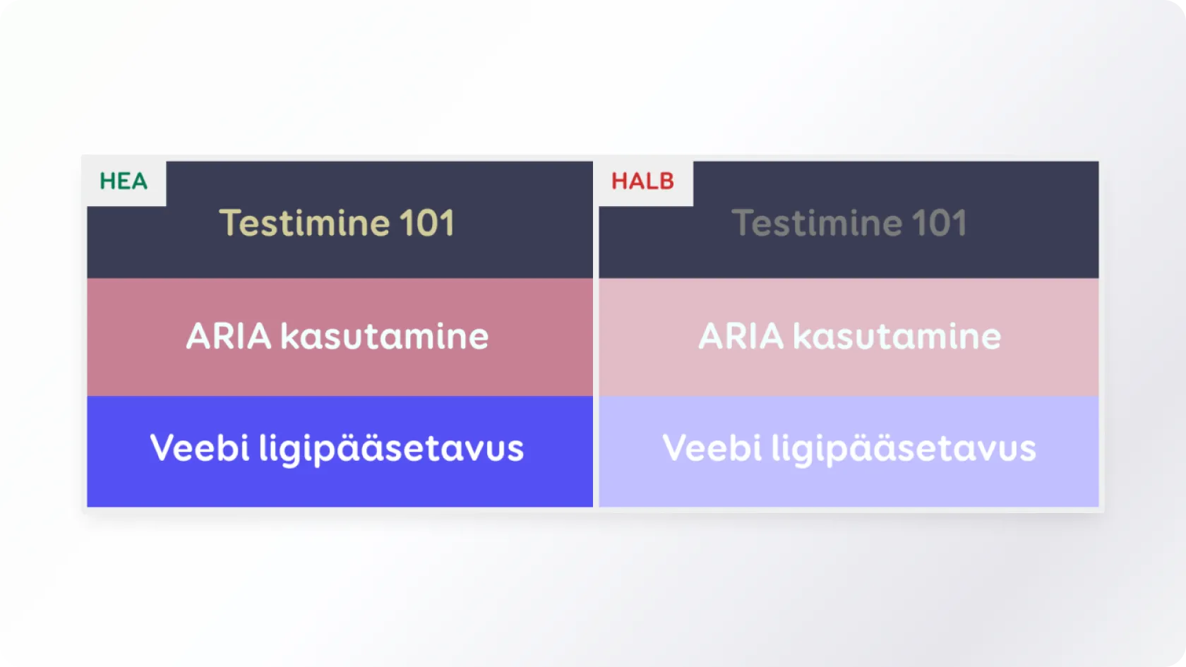 Ava veebipõhine värvikontrastsuse kontrollimise tööriist ning sisesta teksti ja tema tausta värvikoodid (HEX). Kontrastsussuhe peab olema vähemalt 4,5:1, suure teksti korral vähemalt 3:1.