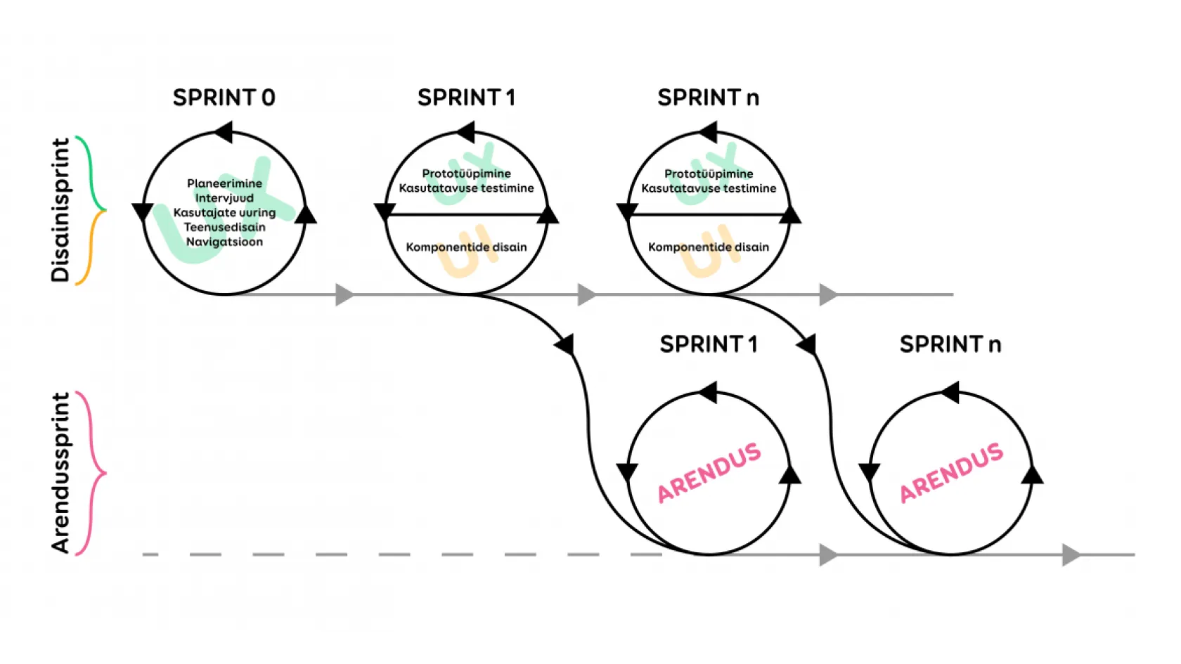 Kasutajauuringuid ei pea tegema korraga kogu tarkvara funktsionaalsusele, vaid läheneda saab temaatiliselt (ehk funktsionaalsuse valitud kogumile). Iga funktsionaalsuse jaoks tehakse eraldi nii UX disain kui UI disain: UX hindab, kuidas iga osa tervikusse ehk suurde pilti sobitub ning UI toodab iga sprindi jaoks ette hulga komponente.