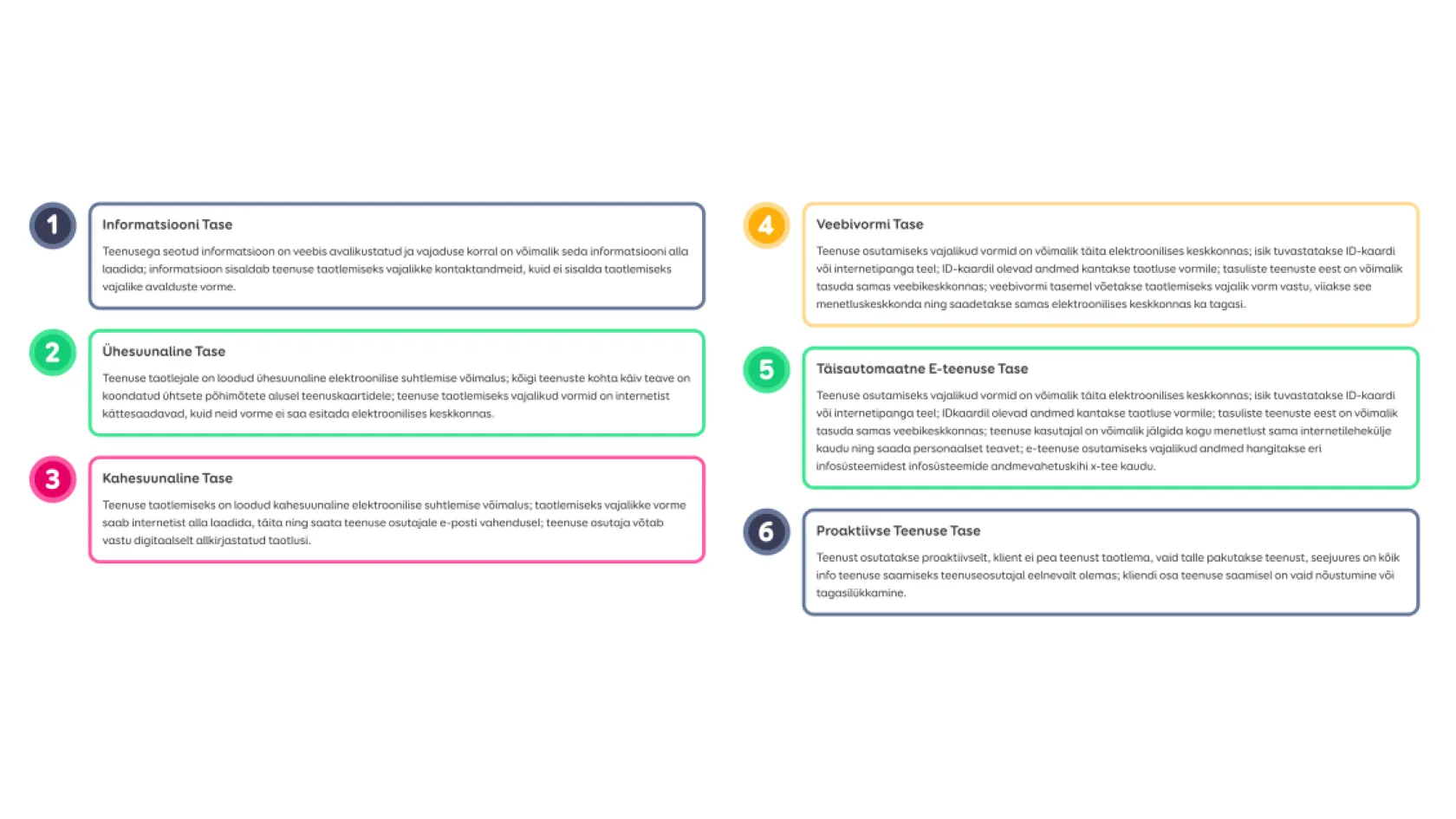 Analüüsis “Avalike teenuste ühtne portfellijuhtimine” töötati välja mudel avalike teenuste tehnoloogilise küpsuse kirjeldamiseks. Madalamate tasemete suunised keskenduvad sellele, et info teenuse kohta oleks kättesaadav.