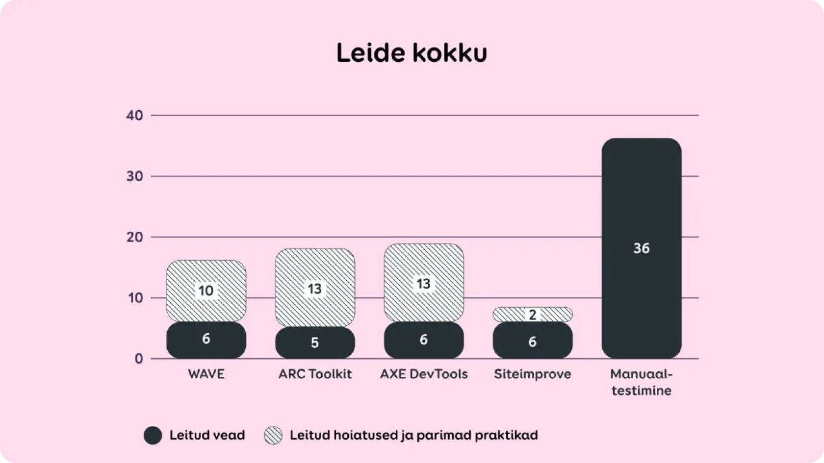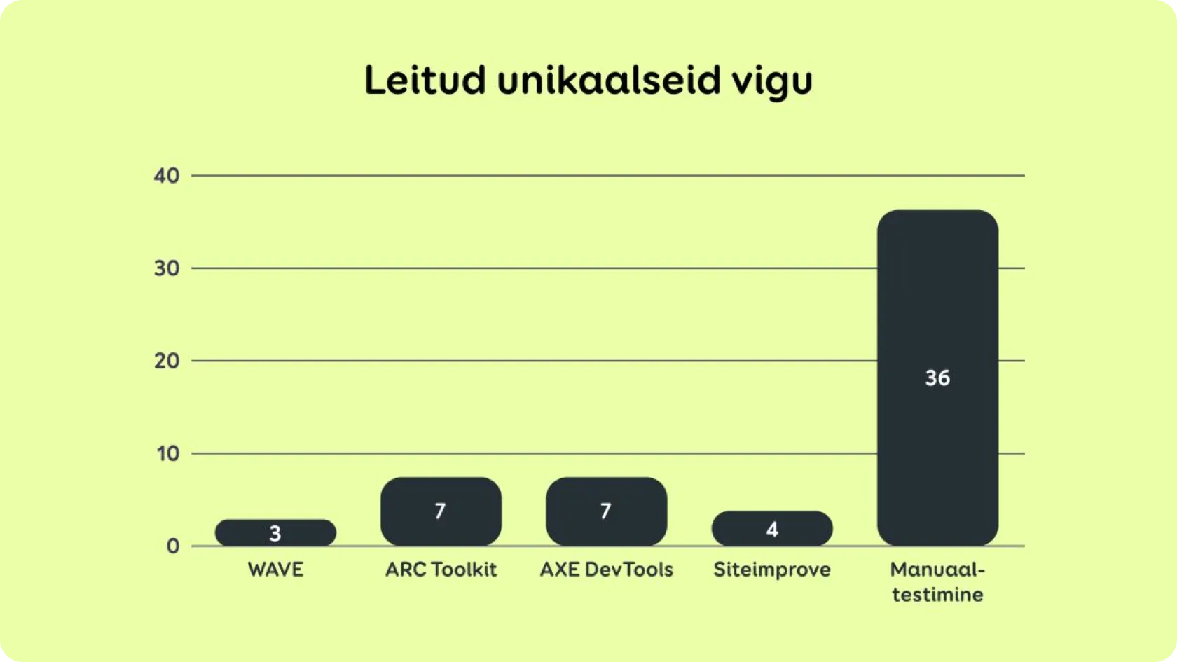 Joonisel 1 esitatud kokkuvõtlikud tulemused näitavad, et automatiseeritud tööriistad tuvastasid oluliselt vähem ligipääsetavuse probleeme kui manuaalne testimine.