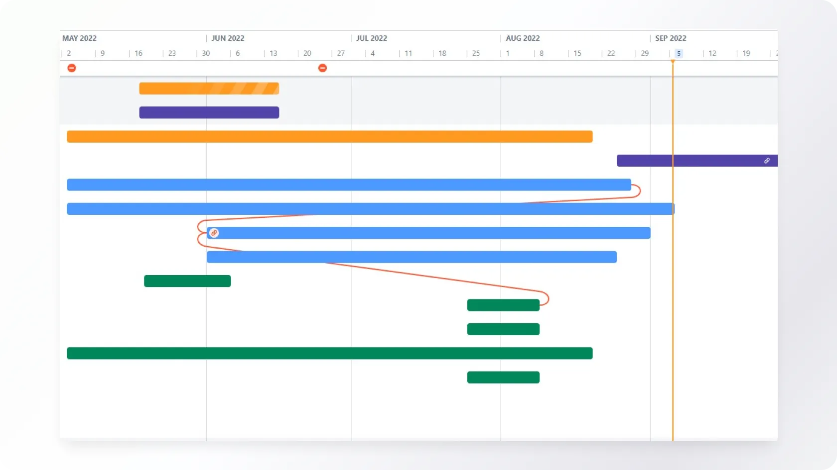 Illustrative view of Advanced Roadmaps timeline. The timeline can be set to week, month, quarter or year. The color of the bars can be configured by different values.