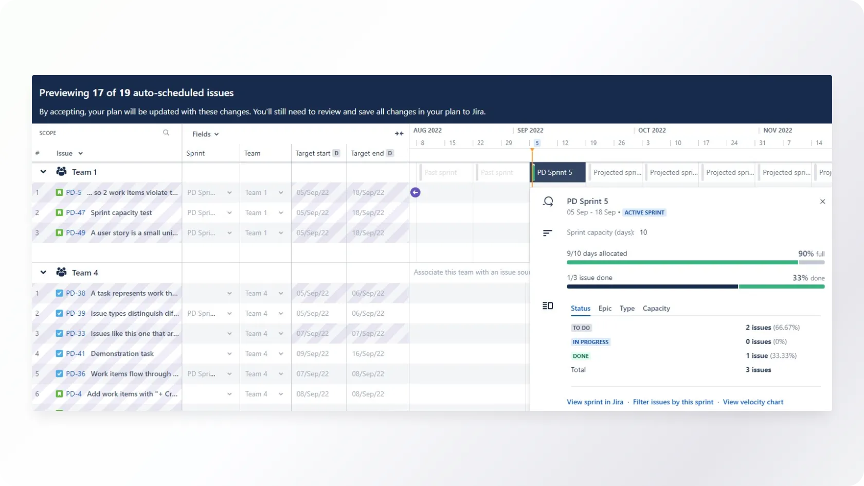 The auto-scheduler would, for example, suggest appropriate target start and target end dates for an issue considering the planning style of a team (Kanban or Scrum), number of team members and capacity per week or sprint.