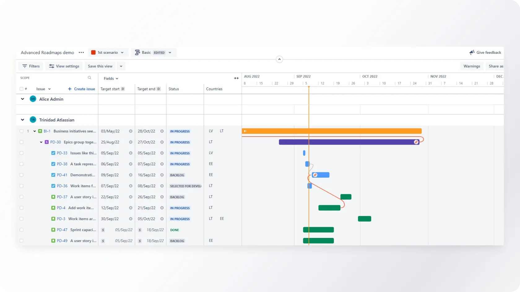 - the sprint assignments of the issues in the plan (if applicable);