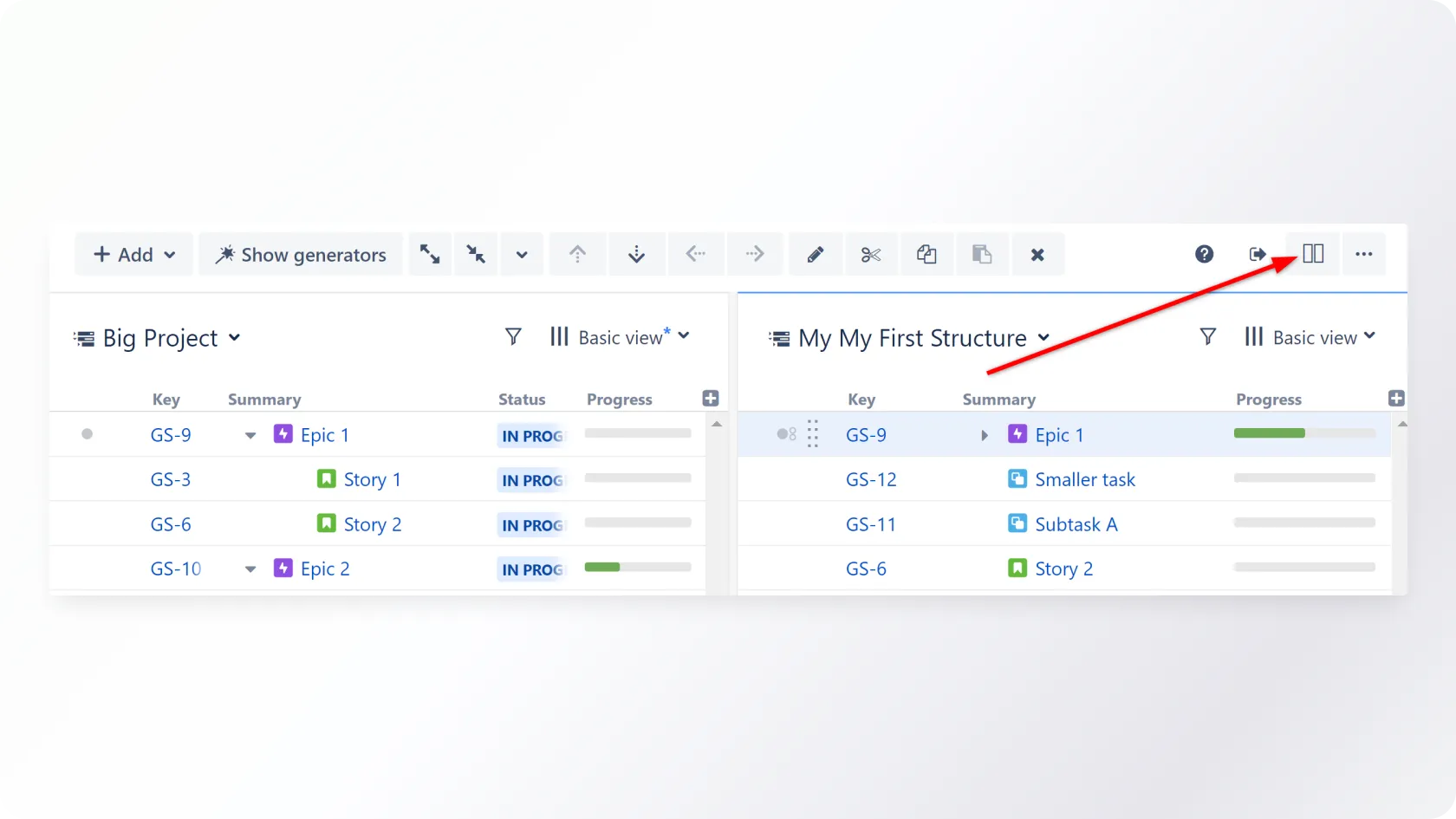 - Double grid view – when the project portfolio boards are related to each other, it is super convenient to work on both simultaneously on the same view. Just change to a double grid view. You can then drag items between two Structures if needed.