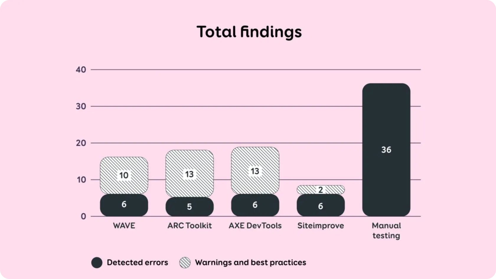 However, the actual number of findings is even smaller, as most automated tools report the same error for each code element separately, which creates repetitions. In Table 1, where we display results by findings, we have grouped repetitive findings into one to make them more comparable to the results of manual testing.