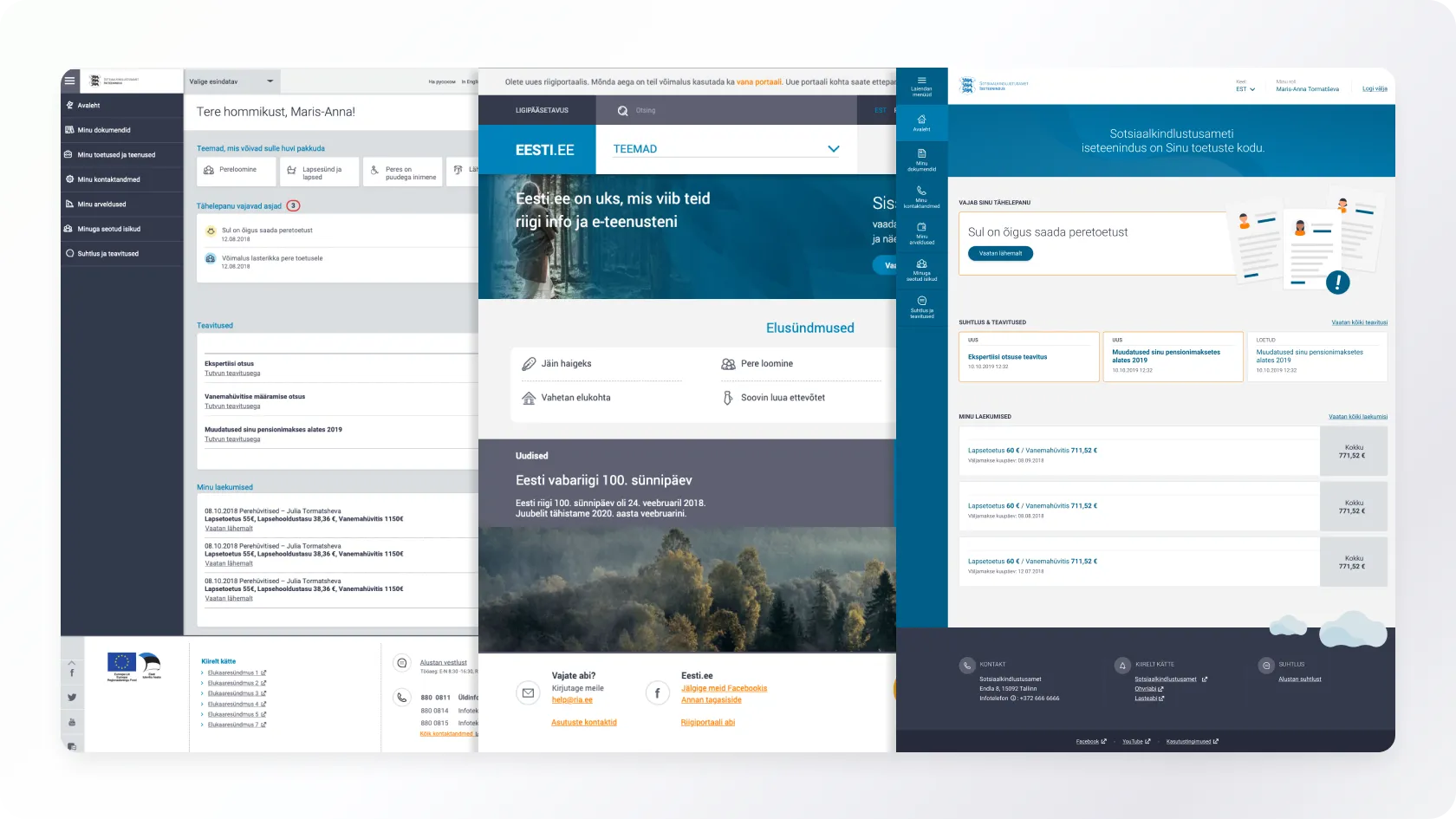 On the left, initial attempts to apply e-Tax Board styles in SKAIS, in the middle, the eesti. ee portal that emerged at the end of 2018, and on the right, the SKAIS design that finally reached the public.