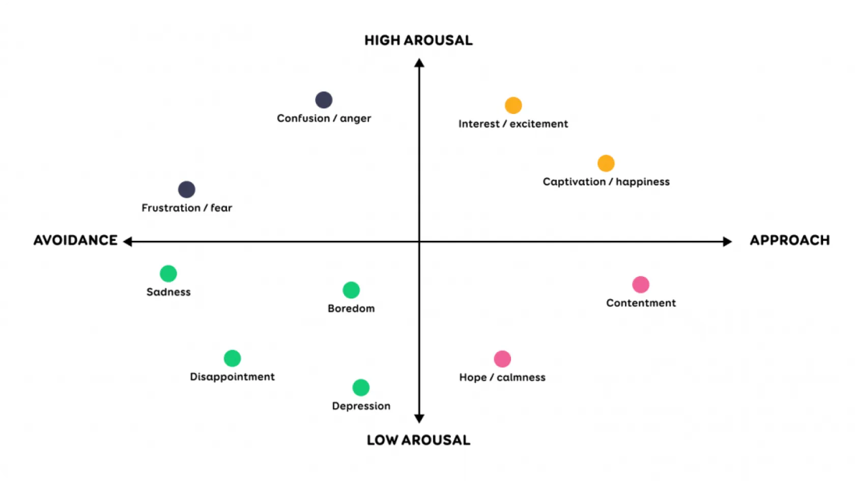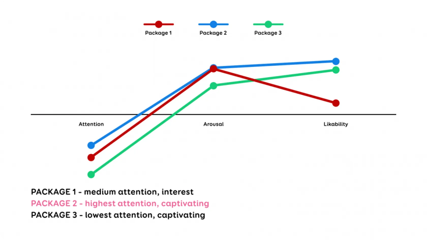 For example, when testing product packaging design, a user interface or a commercial clip, then we are aiming for a result in the upper right quadrant, which shows “a high level of arousal + approach”. There, the user’s interest AKA arousal towards the product is high and is thus very likely to motivate the user to do something for it (e.g., purchase the product or click the button).