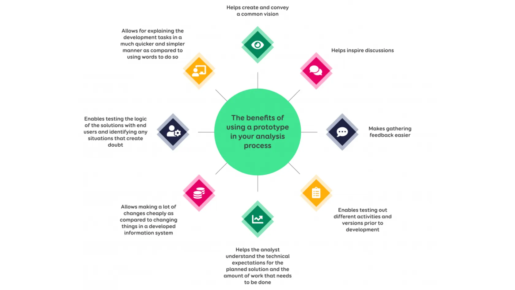 - Early identification of issues: The tight cooperation between the analyst and designer enables to identify potential problems and conflicts in the requirements early on.