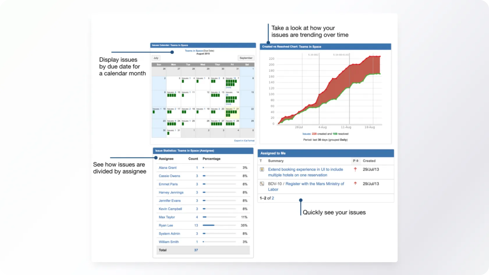 Jira dashboard is a great way to display statistics and overview across project(s) based on desired criteria.