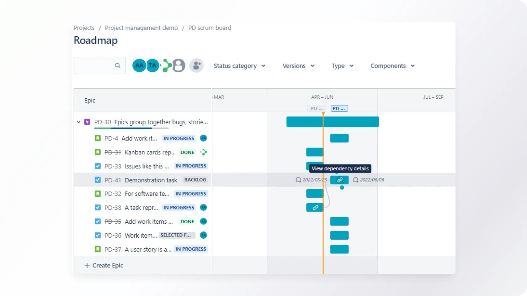 Jira Software Basic Roadmap, on the other hand, displays issues according to a hierarchy: