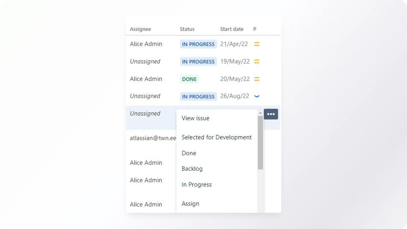 Example of Jira issue search list view. It is possible to change some field values (e.g. status, assignee, comment), but date or custom fields can be changed in the issue detail view.