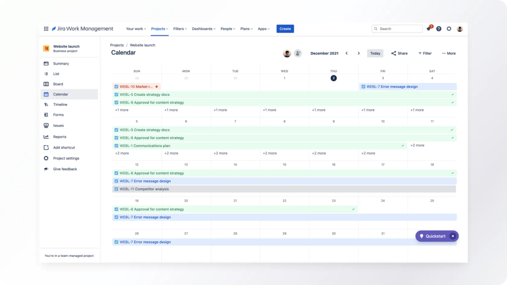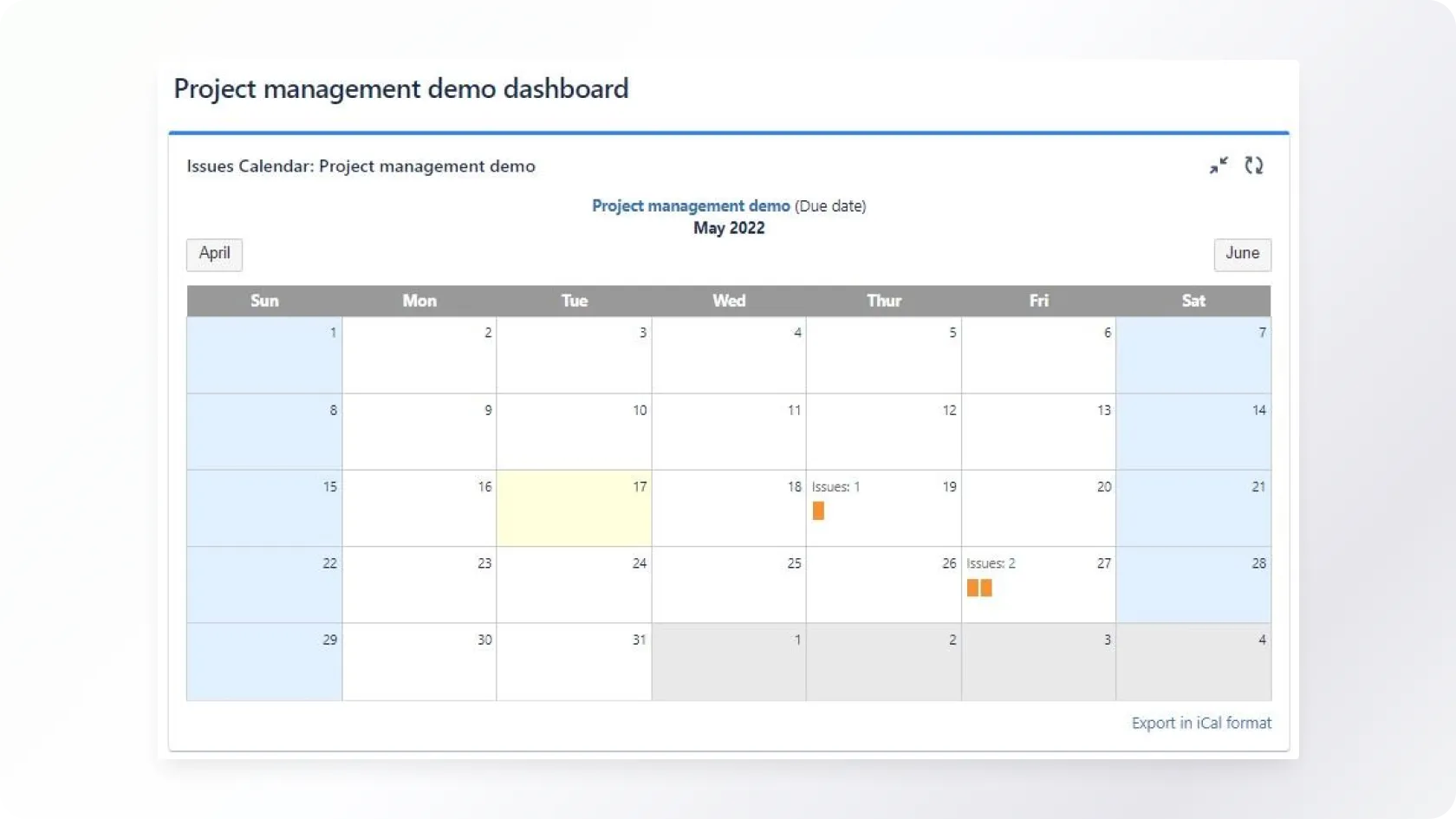It is also possible to create issues in the calendar; however, if many issues have dates set on different months, the view can become quite cluttered.