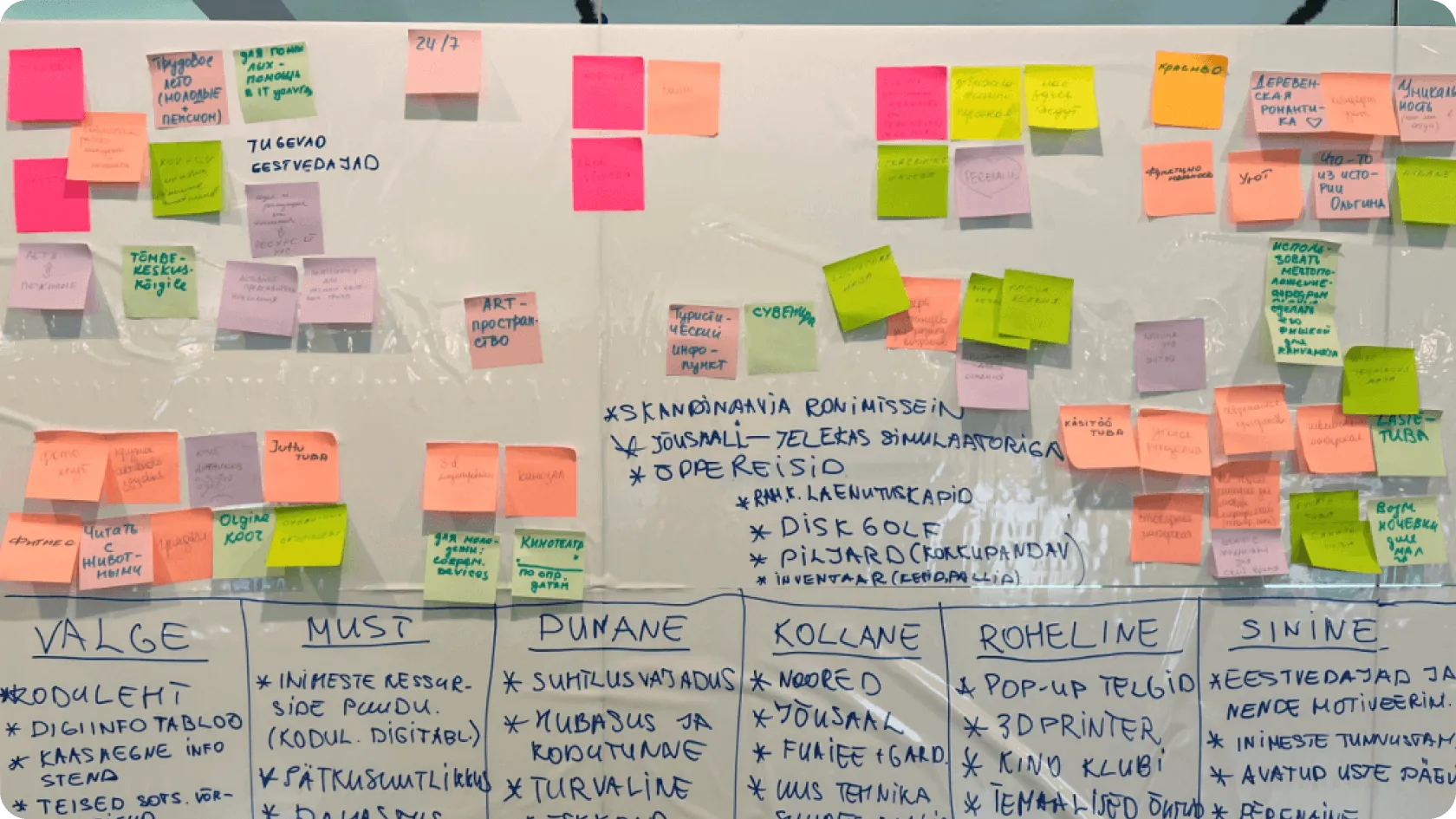 - Creating an affinity diagram, where workshop participants wrote down their ideas individually (one idea per sticky note), and then the moderators collected and grouped these ideas into clusters or themes on the wall. This method enabled idea generation without the influence of groupthink or others’ opinions. It was particularly important for both young people and seniors, as they tend to be more susceptible to peer pressure.