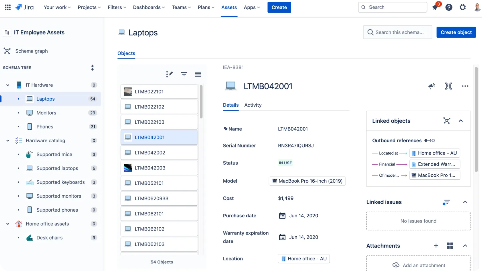 Figure 1. An example of the Assets scheme, showing the structure of the scheme (IT Employee Assets) and a detailed view of one laptop with its attributes and references to other objects (Linked objects).