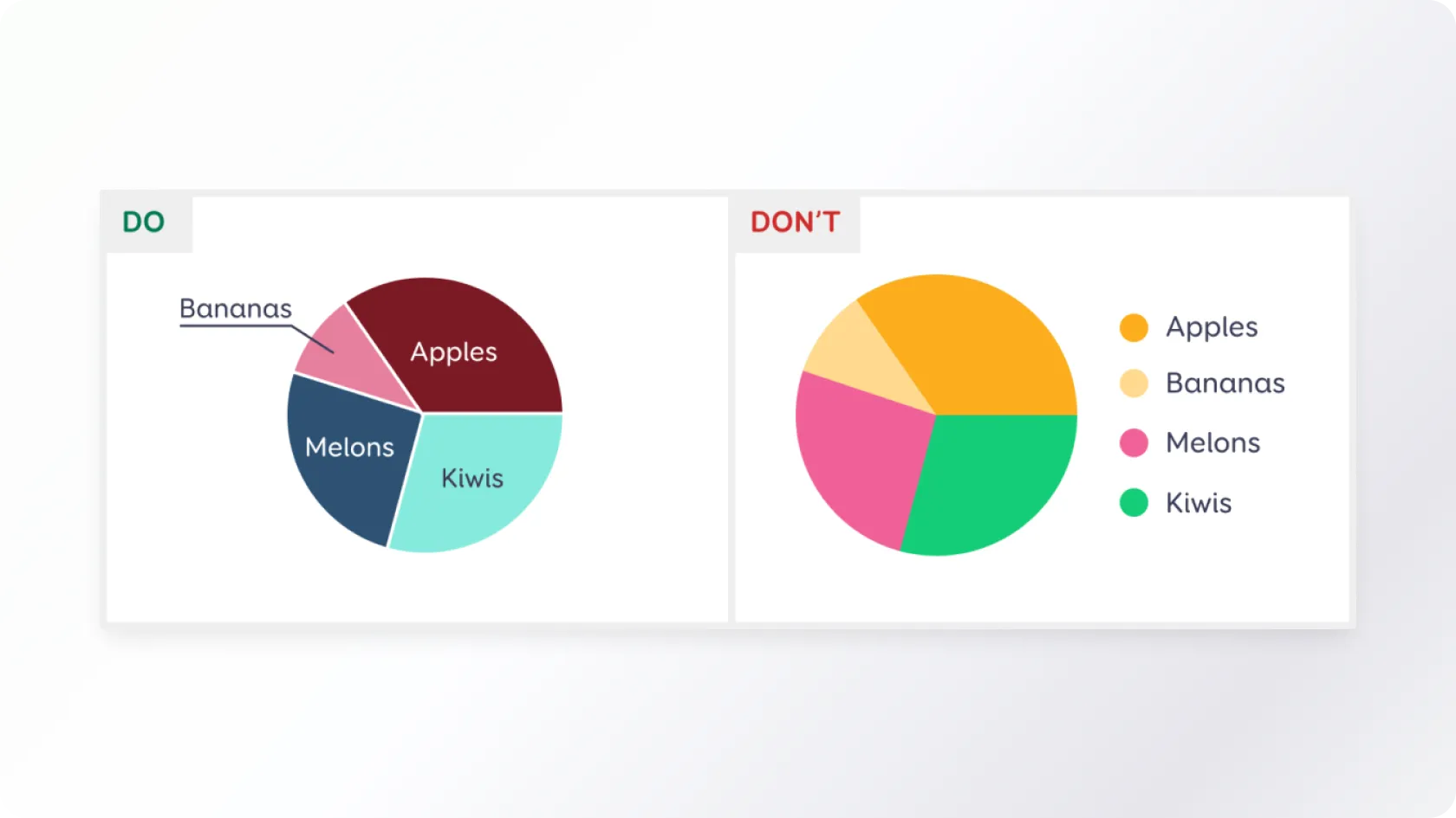 For example, pie charts: instead of linking the sectors to the legend by colour, it would be good to write the labels inside or next to the sectors. It is also good to slightly separate the sectors so that the transition from one sector to another is more visible.