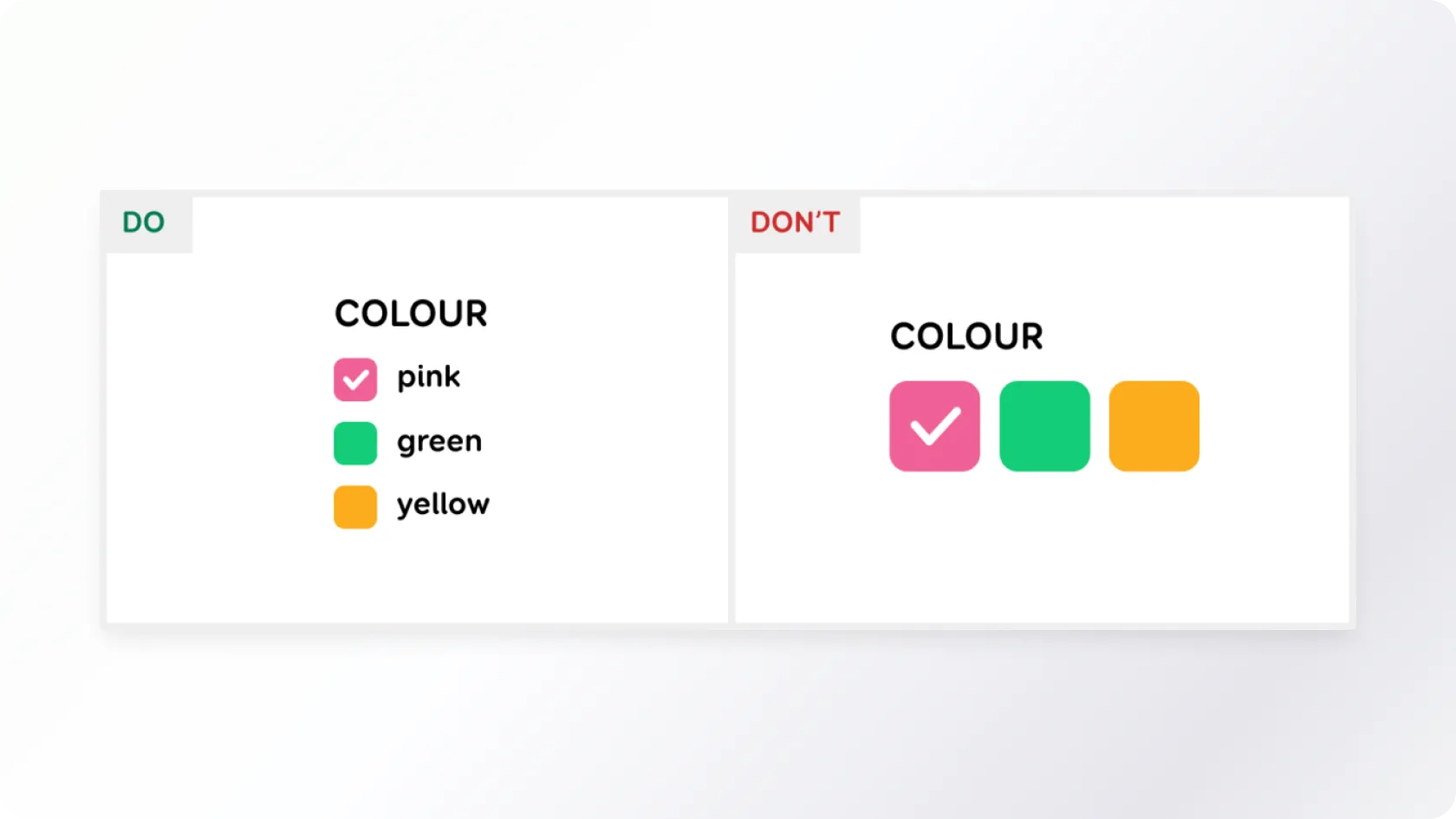 Colour alone shouldn’t be used to differentiate form fields with errors either – you could add an icon or make the border thicker. Another example is the selecting the colour of a product in an online store. Here, too, you should not rely on coloured boxes only, but also write the colour names out in text.
