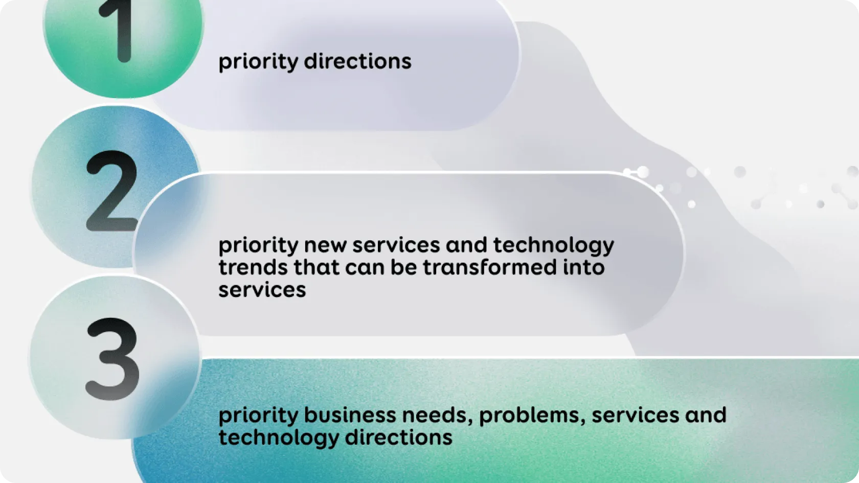Our activities in the year 2021: we updated our analysis methodology. We created 12 new document bases and introduced our own reference base. We were engaged in the creation of TWN business analytics visualizations. - The second layer of innovation - is priority new services and technology trends that can be transformed into services (with an average length of 2-5 years)
